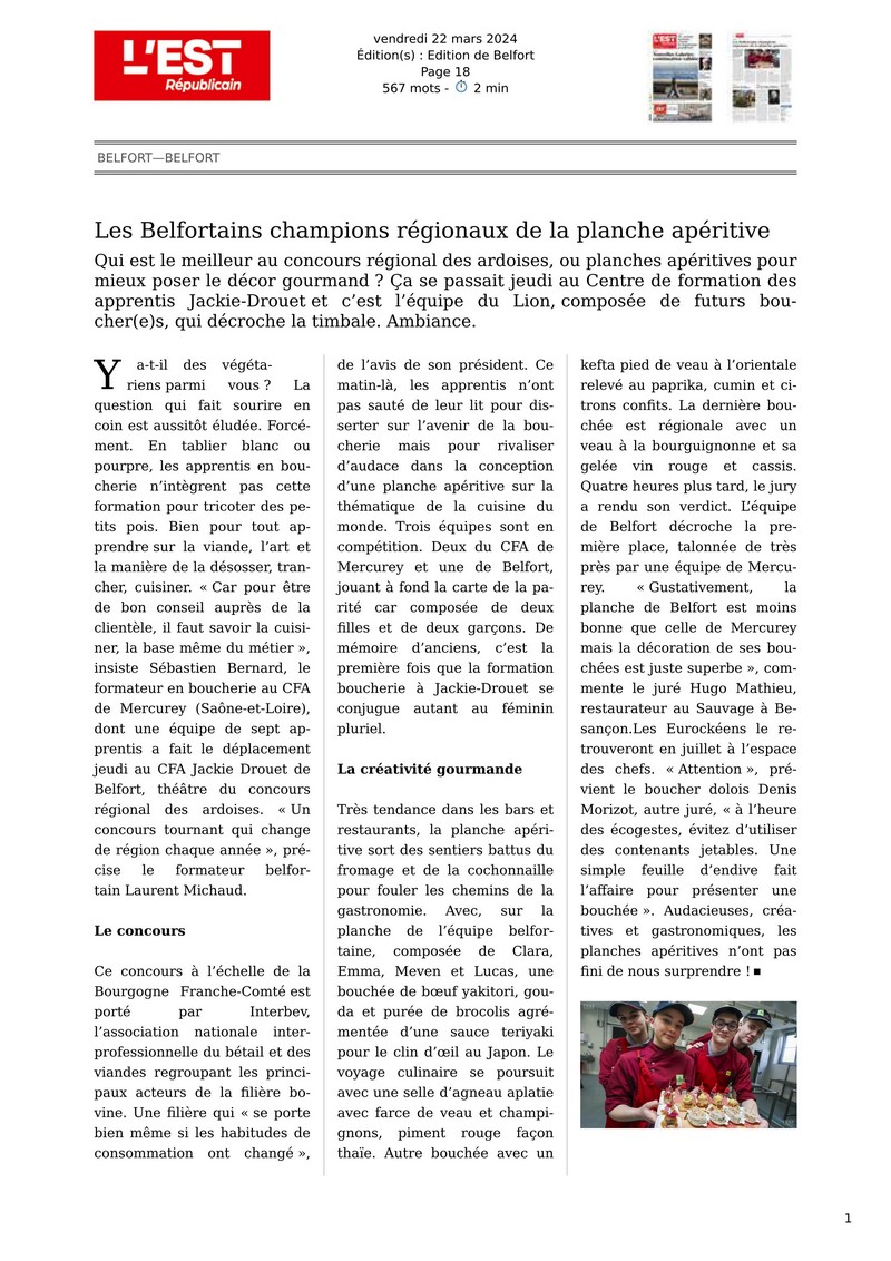 Le jeudi 21 mars 2024 a eu lieu le concours régional des ardoises qui s'est déroulé cette année au CFA Municipal de Belfort. L'équipe Belfortaine décroche la première place ! Un article de l'Est Républicain lui est consacrée :