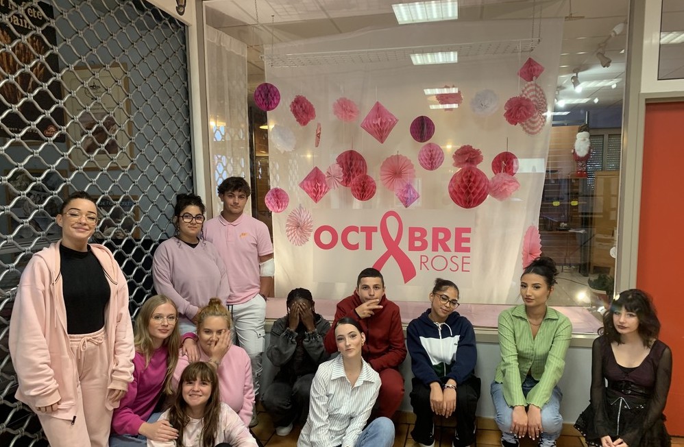 A l'occasion d'Octobre Rose, Mme Sarre, Professeur de Vente, et ses apprentis de la classe de CAP Employé Polyvalent du Commerce 2B ont mis en valeur la vitrine du magasin pédagogique.